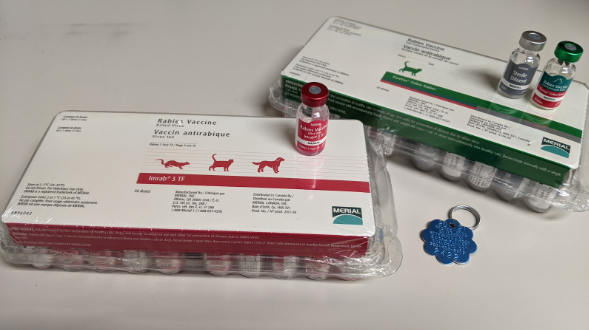 Hello again everyone! Let’s talk about one of the most basic, essential parts of veterinary medicine – the rabies vaccine. First of all, let’s start with the rabies virus. The rabies virus is 100% fatal. I repeat, 100% FATAL. This is a very important point and why we don’t mess around with rabies risk and exposure. The virus is usually spread via bite wounds, but any time that saliva or other bodily fluids from an infected animal or human is exposed to a break in the skin of another animal or human there is potential for transmission. I’m including some information from the CDC in the reference list that gives way more detailed information about the virus for those that like full scientific explanations. Once the virus is in a person or animal’s bloodstream, it fuses with cell envelopes to get inside, and then uses the machinery that a cell already has inside of it for normal cellular activity to replicate. Once the cell has made more copies of the virus, the new copies of the virus “bud” out of the cell in little packets that then go on to infect other cells in that person or animal. The virus infects and buds from cells in the salivary glands. The goal of a virus is to get to the next “host” (susceptible person or animal), so the virus has evolved to induce aggression and biting – the perfect way to transmit that virus from the salivary glands to the next host. Eventually, the virus spreads to the brain and causes the cells in the brain to die, leading to the death of the person or animal that the virus is living in.
