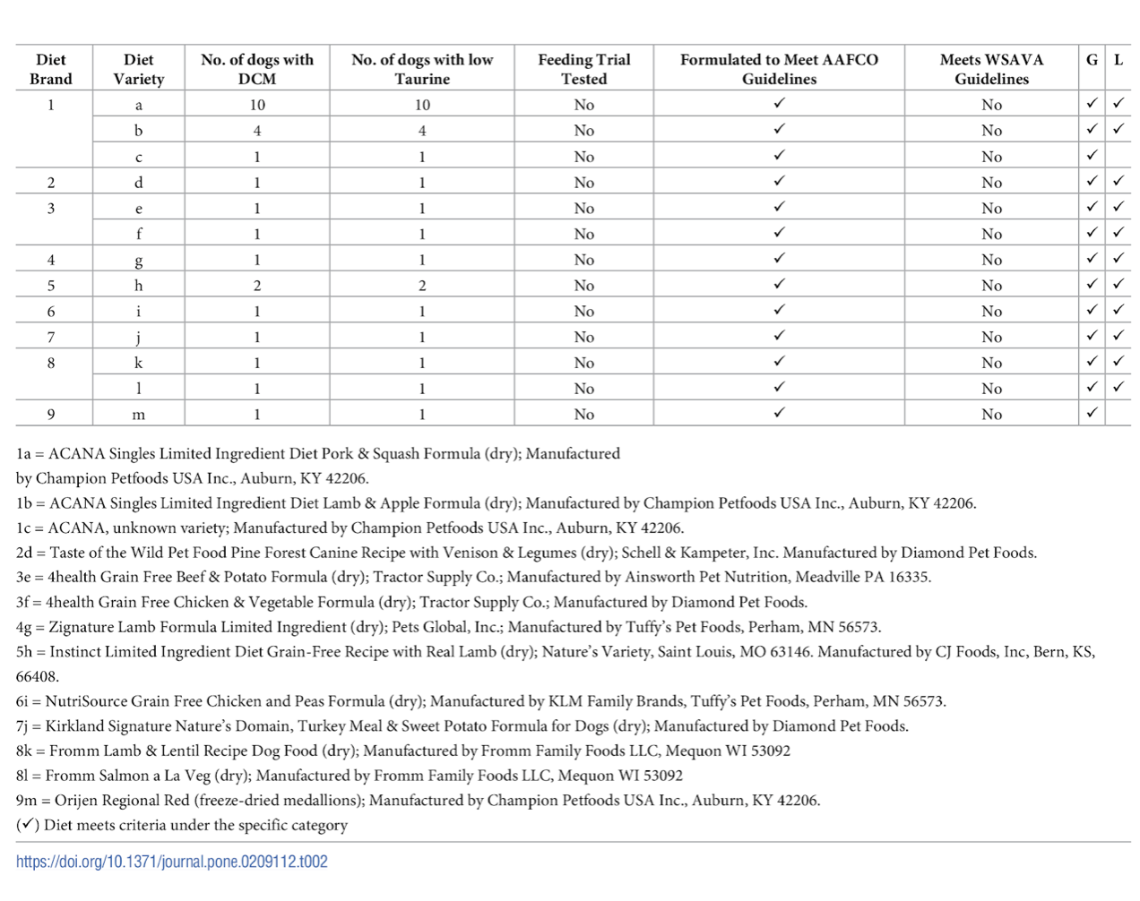 And on December 13th, 2018 a study by Kaplan et. al titled “Taurine deficiency and dilated cardiomyopathy in golden retrievers fed commercial diets” was published that looked at the echocardiograms, blood taurine levels, diet, and medical histories of 24 golden retrievers that had dilated cardiomyopathy and were taurine deficient, and 52 healthy golden retrievers. It is a very dense article, so I pulled out the table that lists the specific brands that were looked at in this study: https://journals.plos.org/plosone/article?id=10.1371/journal.pone.0209112